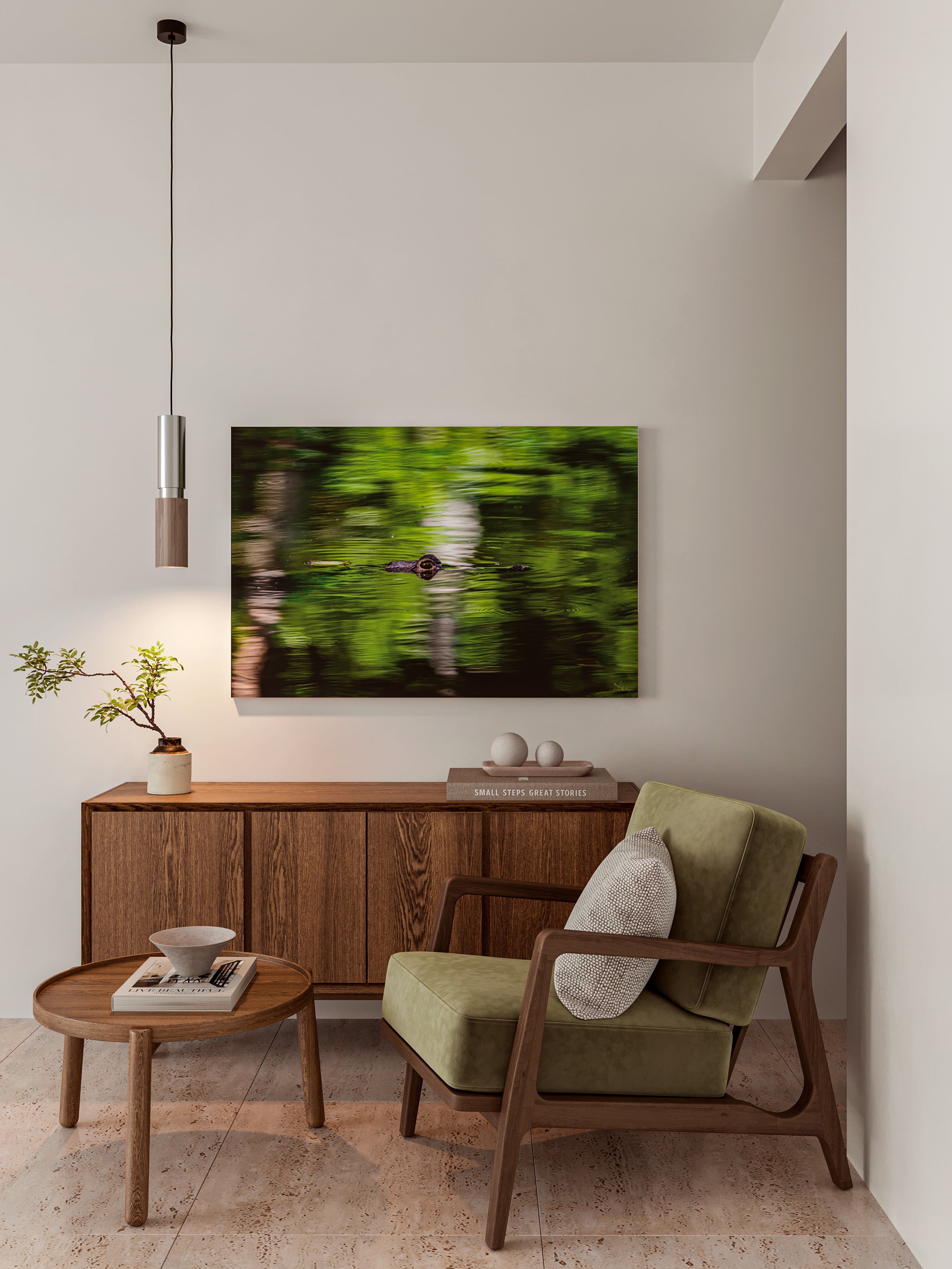 Esta obra captura el instante en que un cocodrilo emerge sutilmente del agua, revelando una presencia silenciosa y contenida. La imagen transmite tensión, calma y vigilancia, invitando al espectador a contemplar el equilibrio entre quietud y movimiento en el entorno natural.