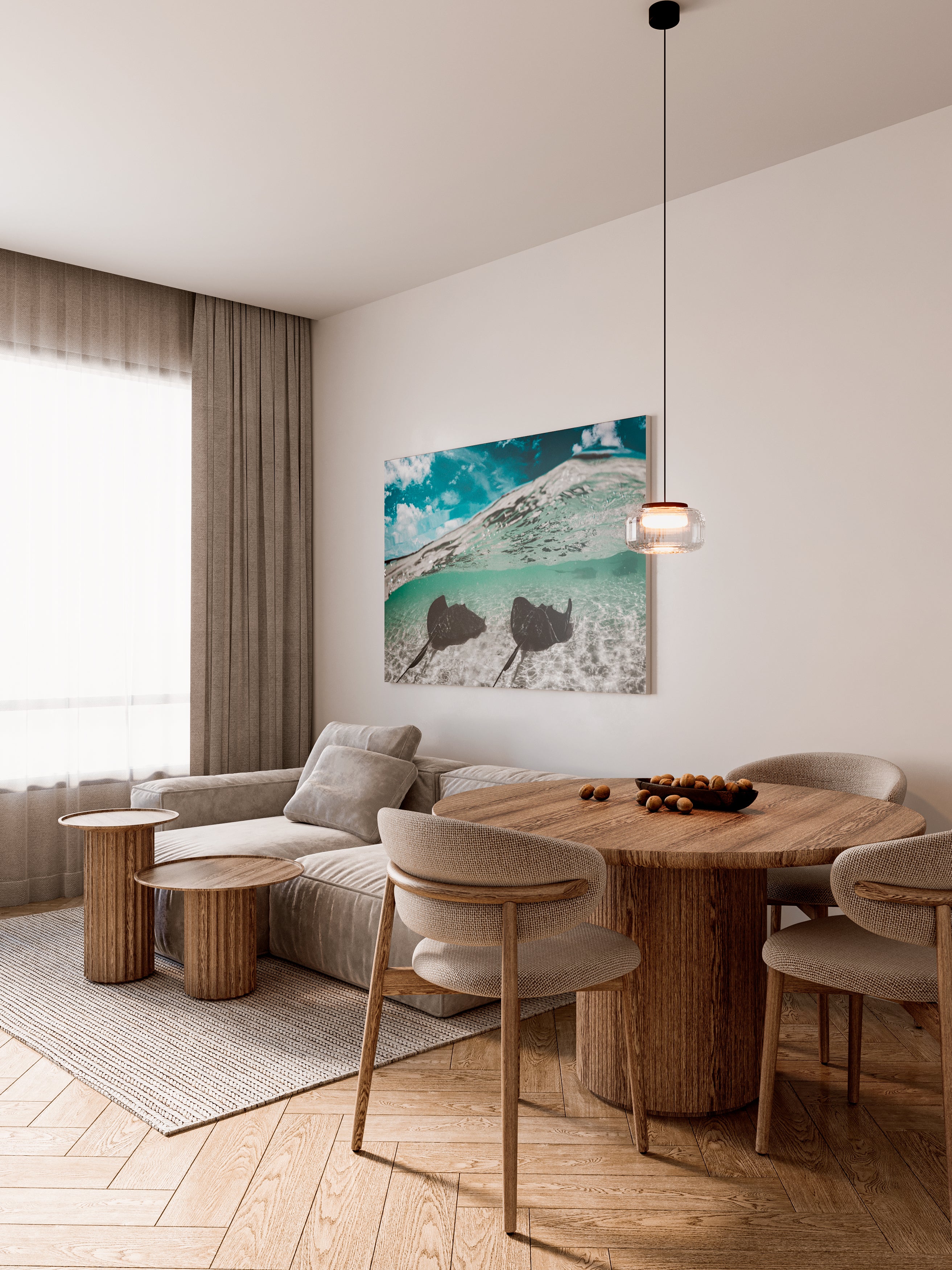 Esta obra captura a dos mantarrayas desplazándose muy cerca de la arena, suspendidas en un mar de tonalidades turquesa y verde claro. La imagen transmite una sensación de calma, ligereza y armonía, invitando a contemplar la elegancia natural de estas criaturas en su entorno.